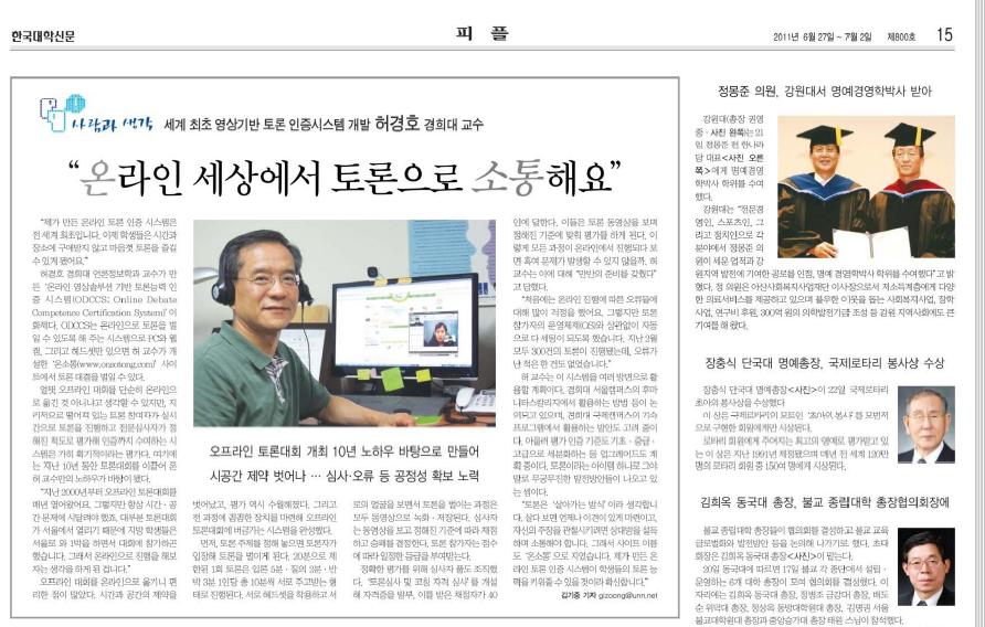 허경호 경희대 언론정보학부 교수<사진>가 만든 ‘온라인 영상솔루션 기반 토론능력 인증 시스템(ODCCS; Online Debate Competence Certification System)'이 화제다. ODCCS는 온라인으로 토론을 벌일 수 있도록 해 주는 시스템으로 PC와 웹캠, 그리고 헤드셋만 있으면 허 교수가 개설한 ‘온소통(www.onsotong.com)' 사이트에서 토론 대결을 벌일 수 있다.